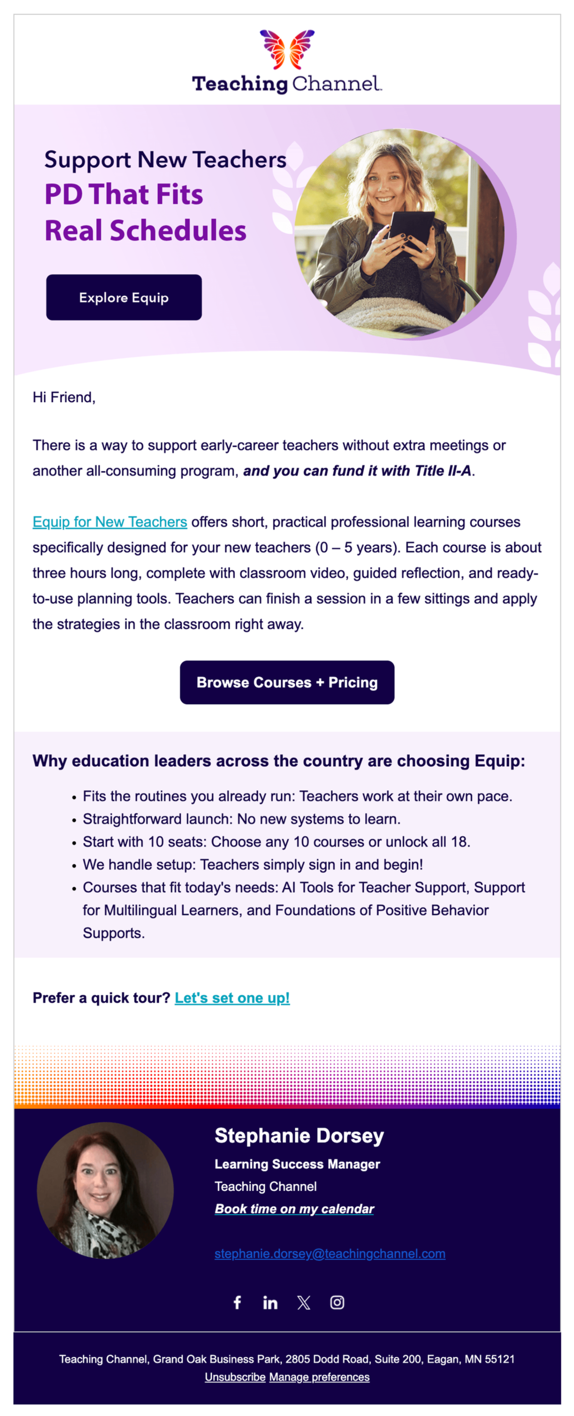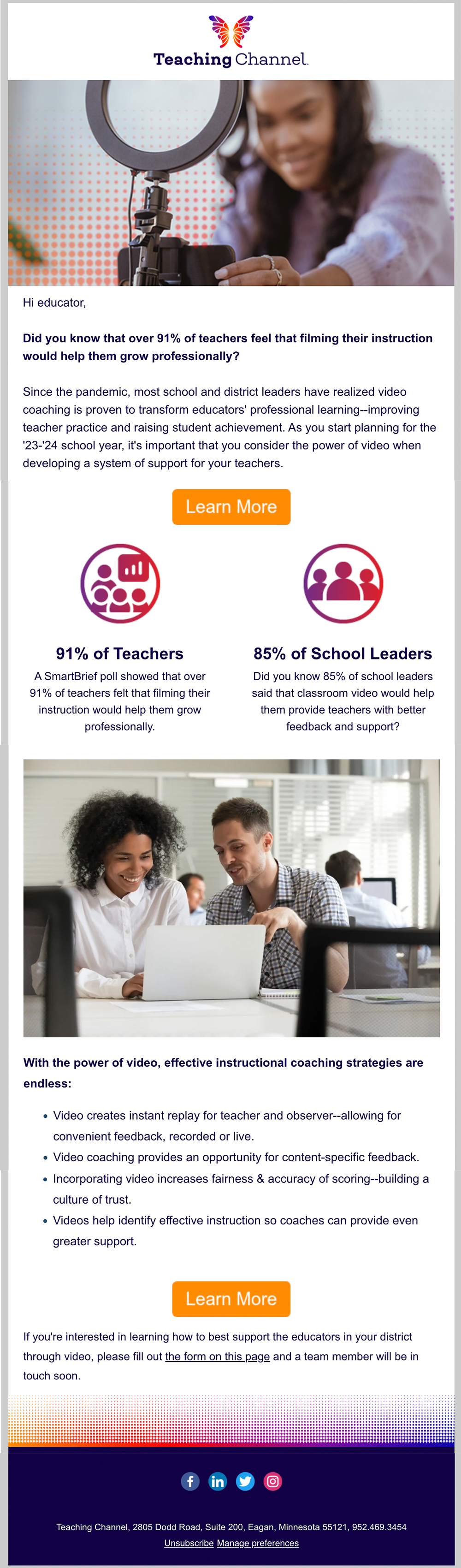 At Teaching Channel, I create high-converting landing pages that drive lead generation and campaign success. My process includes strategic planning based on audience data, conversion-focused copywriting, and A/B testing key variables like headlines, CTAs, and form fields to optimize performance. Each page integrates with HubSpot for seamless lead tracking while maintaining brand consistency and maximizing campaign ROI.
